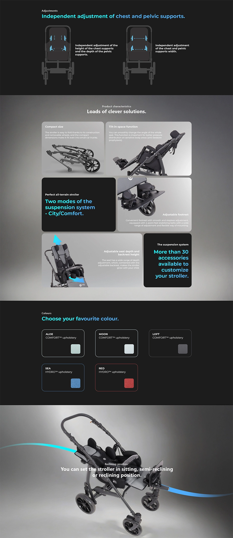 The tilt-in-space function, reclining backrest, and adjustable angle of the footrest allow you to put the stroller in the reclining position easily and quickly, allowing for a change of a child’s position depending on their health needs. The reversible seat allows forward or rearward travel, which encourages the child to explore the surroundings or have direct visual contact with the caregiver.