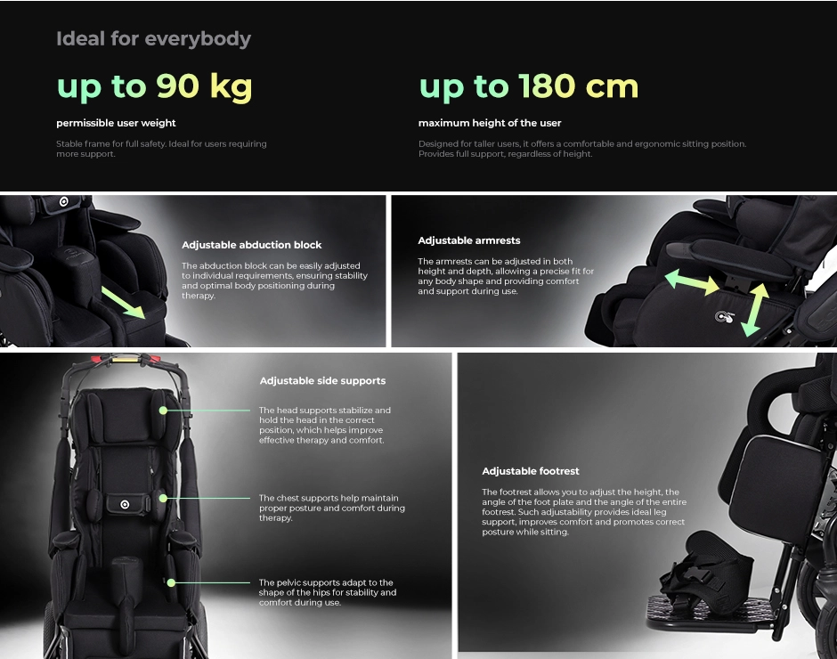 Suitable for individuals with both reduced and increased muscle tone, DOMINATOR Pro™ has a robust frame made from durable materials, ensuring long-term satisfaction with the stroller’s use.