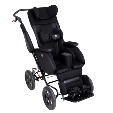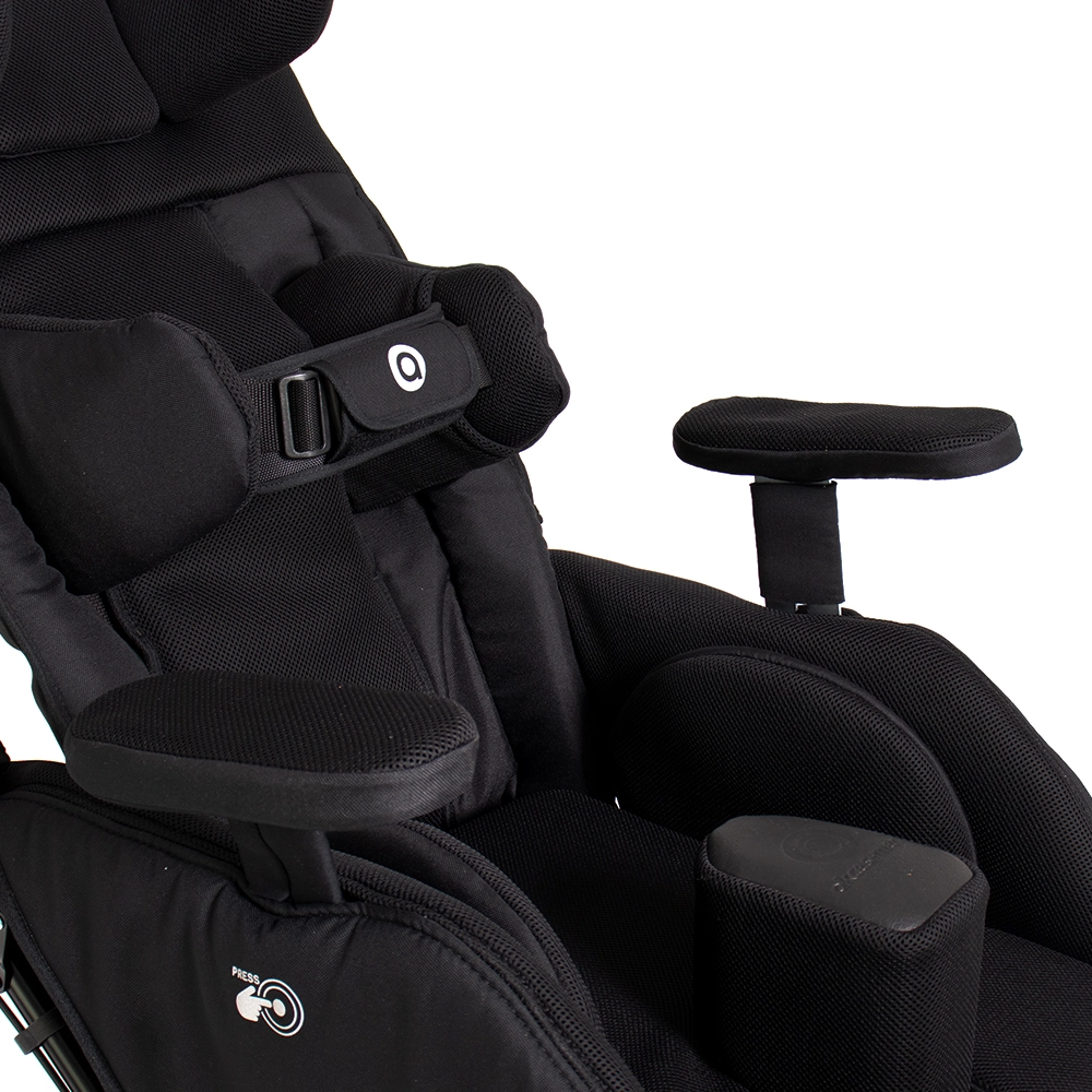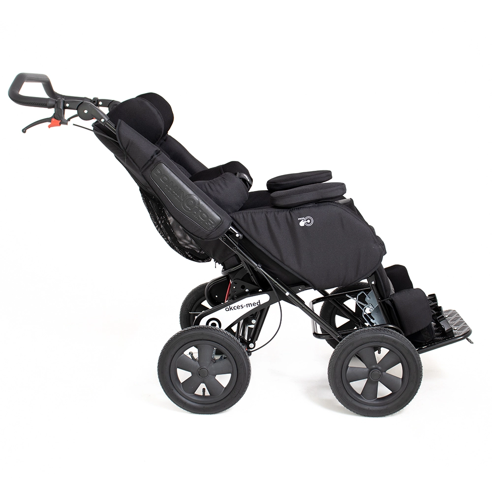 Combined with the adjustment of the backrest angle (recline), seat (tilt-in-space function), and footrests, maintaining an optimal, corrected, safe, and comfortable sitting, semi-sitting, or lying position is much easier than with other special strollers.